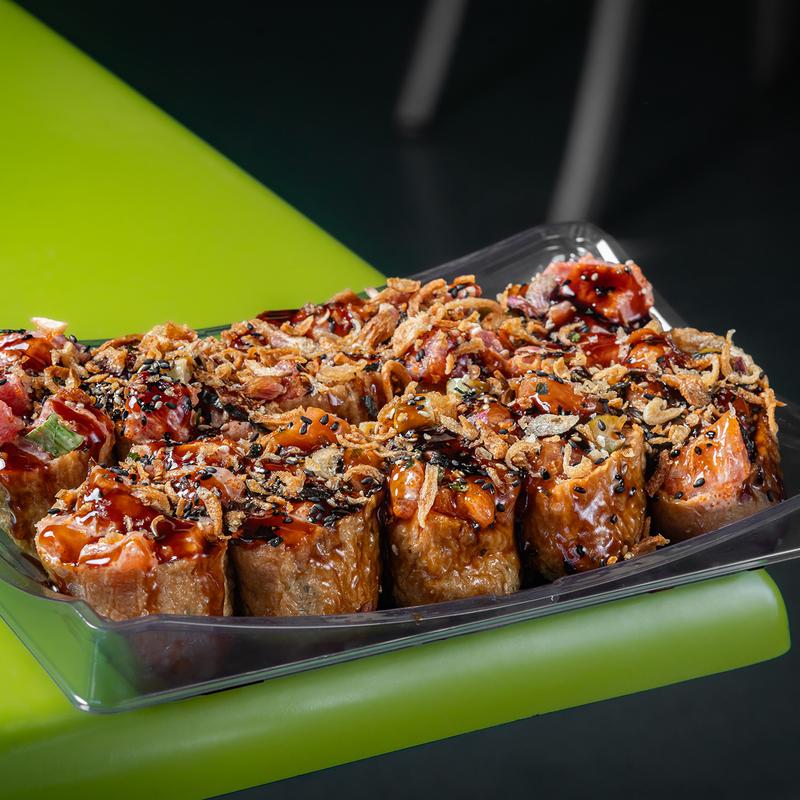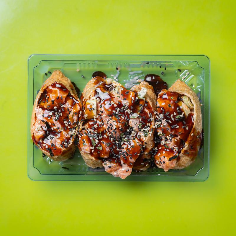 Spicy salmon inari tofu, rice, furikake, green onion, and crispy onion. Topped with sweet sauce.