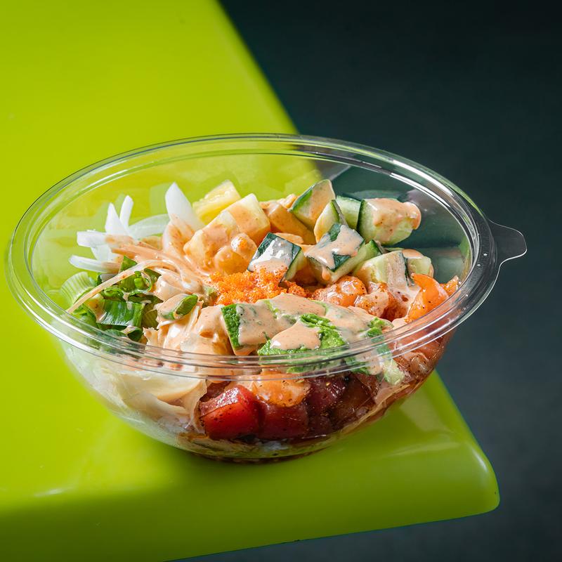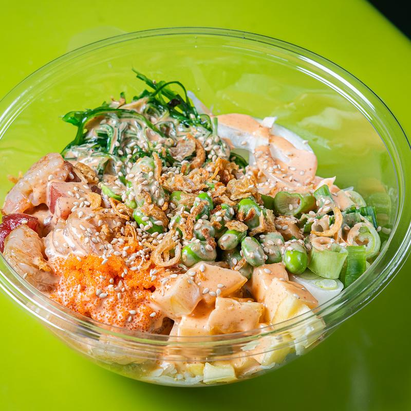 Ahi tuna and shrimp with shoyu sauce, cabbage, white onion, scallions, edamame, pineapple, seaweed salad, sesame seed, masago, and crispy onion, topped with spicy mayo.