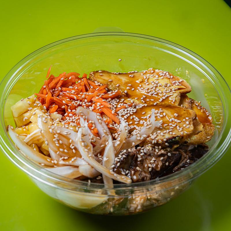Kalua pork, oka tuna, cabbage, cucumber, scallions, onion, pineapple, and sesame seeds. Topped with teriyaki sauce.